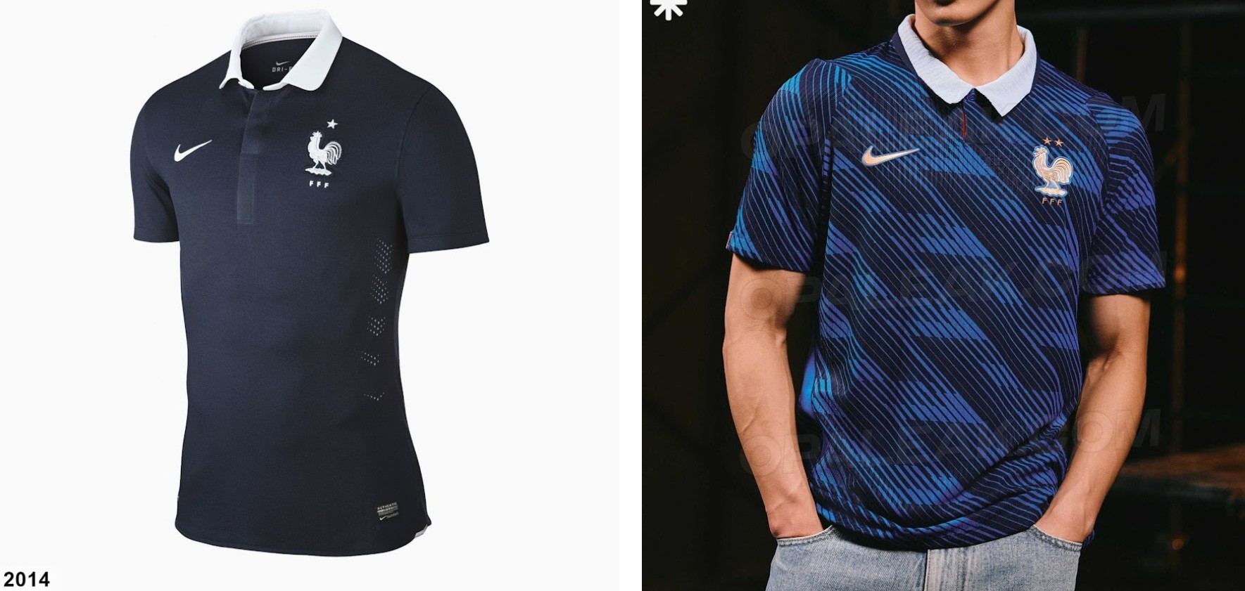 球衣搭配一款现代化的白色翻领设计,领口后部过渡为海军蓝,并在内部隐藏红色细节,呼应法国国旗的三色元素。这样的设计也让人联想到2014年世界杯时法国队的经典翻领球衣。